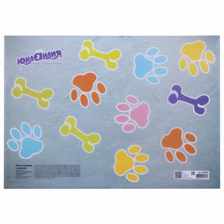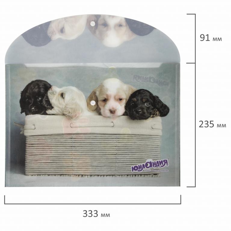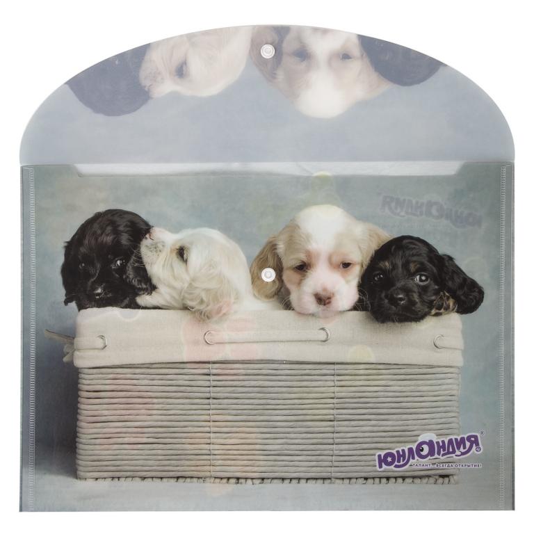 Папка-конверт формата А4 из плотного пластика в 160 мкм с полноцветной печатью. Закрывается на защелку-кнопку, что способствует удобству для частого использования и обеспечивает быстрый доступ к бумагам. Вместительность до 100 листов поможет хранить или взять с собой необходимые документы. Гладкая фактура с полноцветным рисунком щенков вызовет улыбку у ребенка и взрослого. Папка ЮНЛАНДИЯ практична в использовании и надежно защитит документы и сбережет их от повреждений, пыли и влаги.