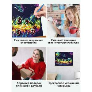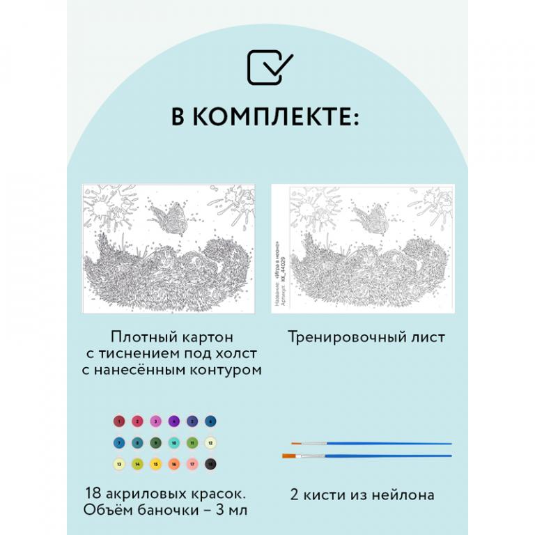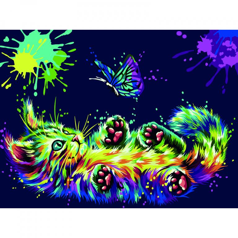 Краски обладают высокой плотностью, что позволяет перекрыть нанесенный контур в 1 слой. Технология точной разбивки сюжета картины на разные цветовые оттенки гарантируют правильность выполнения рисунка. Законченная работа с изображением милого котенка, играющего с бабочками, займет почетное место в интерьере или станет отличным подарком. Рисование по номерам способствует развитию внимания, учит концентрации и аккуратности, помогает понять, как построить фигуру через цветовые оттенки, развивает чувство вкуса.