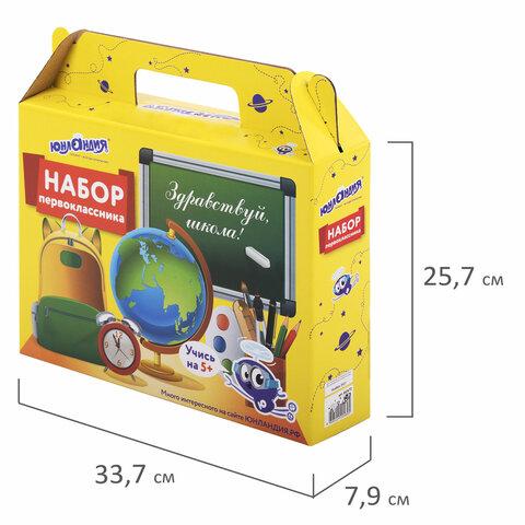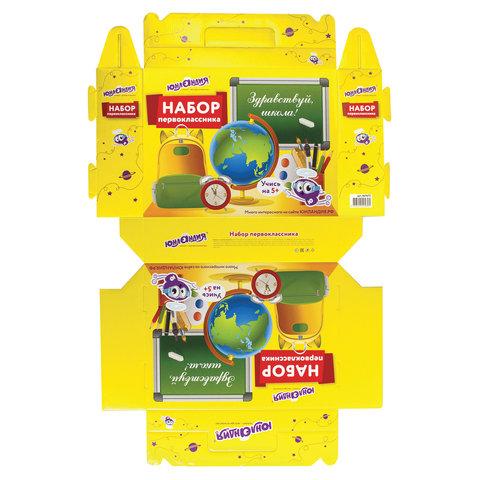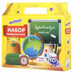 Короб представляет собой подарочную коробку-портфель, в которую можно положить все самое необходимое для первоклассника в первые дни занятий: письменные и канцелярские принадлежности.