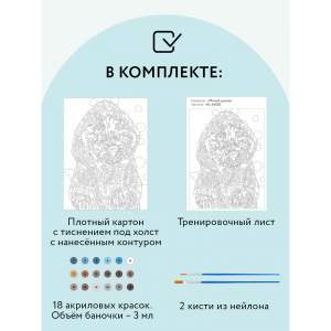 1. Плотный картон с тиснением под холст размером 30х40 см с нанесенным контуром, пронумерованный в соответствии с номерами красок;