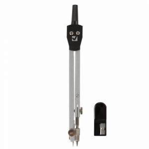 Циркуль длиной 140 мм имеет одну сгибаемую штангу и подстраиваемую иглу. Изготовлен из металла, дополнительный цвет элементов — черный.