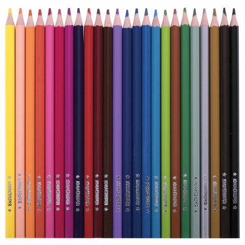 Набор состоит из 24 цветов: черный, темно-синий, синий, голубой, салатовый, зеленый, темно-зеленый, болотный, серо-зеленый, желтый, оранжевый, темно-оранжевый, персиковый, фуксия, розовый, красный, темно-красный, бордовый, песочный, серый, светло-серый, фиолетовый, темно-коричневый, коричневый. Шестигранная форма сечения корпуса позволяет не скатываться карандашу с поверхности стола во время занятий рисованием. Они изготовлены из высококачественного пластика и имеют лакированный корпус. Качество исполнения гарантирует легкую заточку. Грифель диаметром 3 мм обладает повышенной прочностью. Все карандаши заточены и поставляются в картонной упаковке с европодвесом.