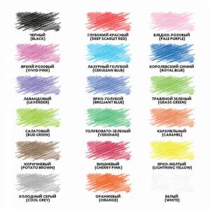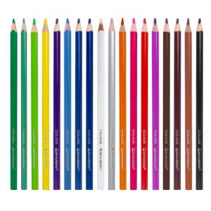 Набор состоит из 18 цветов: черный, темно-синий, синий, голубой, салатовый, зеленый, темно-зеленый, желтый, оранжевый, фуксия, розовый, красный, бордовый, серый, светло-серый, фиолетовый, темно-коричневый, коричневый. Трехгранная форма сечения корпуса позволяет не скатываться карандашу с поверхности стола во время занятий рисованием. Они изготовлены из древесины ценных пород и имеют лакированный корпус. Высокосортная древесина и качество исполнения гарантируют легкую заточку. Грифель диаметром 3,3 мм обладает повышенной прочностью. Все карандаши заточены и поставляются в картонной упаковке с европодвесом.