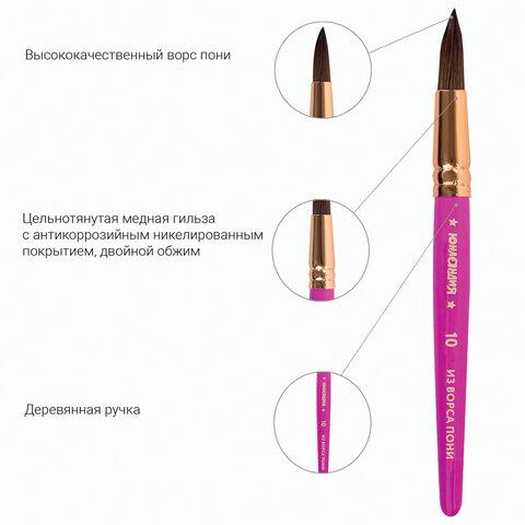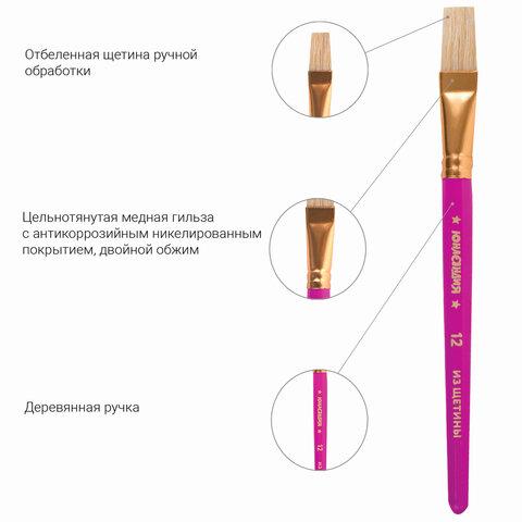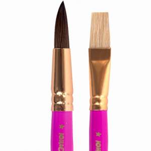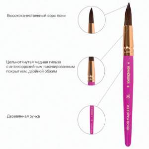 Кисти из волоса пони отлично впитывают и отдают краску, а кисти из щетины обладают высокой упругостью, хорошо держат форму, долговечны и надежны. Утолщенную рукоятку кисти удобно держать в руке. В наборе круглая кисть из ворса пони №10 и плоская кисть из щетины №12.