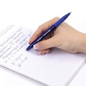 Ручка пишет специальными гелевыми чернилами синего цвета. Для удаления надписи её необходимо потереть специальным ластиком, встроенным в корпус ручки. При письме и стирании ручка не повреждает бумагу, делая исправления незаметными. Диаметр пишущего узла 0,7 мм создает тонкую линию письма, равную 0,35 мм. Резиновый держатель для комфортного и длительного использования. Стильный корпус тонированного синего цвета с синими деталями и прозрачным колпачком.