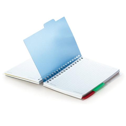 Блокнот формата А6 на евроспирали содержит 150 листов с линовкой в клетку, что позволяет зафиксировать большой объем нужной информации. Имеет боковое расположение переплета, 4 разделителя. Обложка из пластика защищает внутренний блок от износа и деформации. Внутренний блок состоит из белой офсетной бумаги плотностью 60 г/