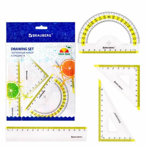 Набор чертежный BRAUBERG «FRESH ZONE» изготовлен из прочного прозрачного пластика со шкалой желтого цвета. Поставляется в пластиковом пакете с европодвесом.