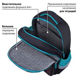 В основном отделении рюкзака можно легко и быстро разместить учебники и тетради формата А4+, а также воспользоваться прижимным отделением. Большое переднее отделение вмещает тетради и учебники формата А4, а дополнительный кармашек на молнии подойдет для хранения мелочей. Такая организация пространства поможет держать принадлежности в сохранности и приучить ребенка к порядку.