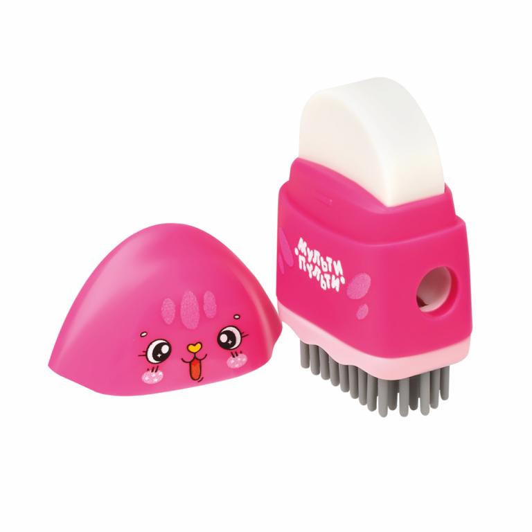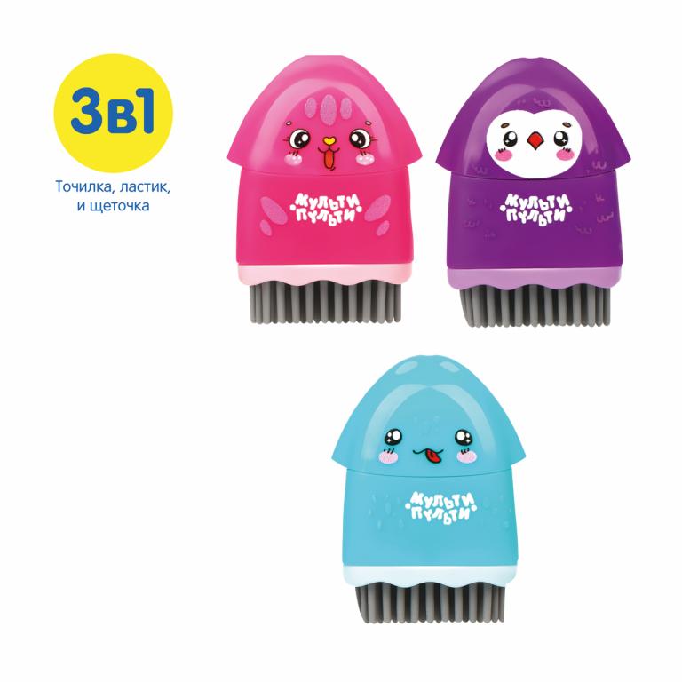 Пластиковая точилка «Милашки» отлично справится с заточкой карандашей. Точилка содержит отверстие для заточки стандартных карандашей диаметром до 8мм, а под верхней крышкой расположен качественный ластик. Снизу расположена силиконовая щёточка для удаления с бумаги отходов стирания, которая органично дополняет дизайн точилки. В наборе представлены 3 варианта точилки с различными персонажами и цветовыми решениями. Вы можете выбрать одного героя, а можете собрать всех в свою коллекцию.